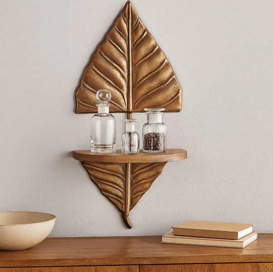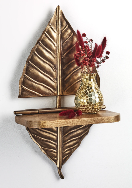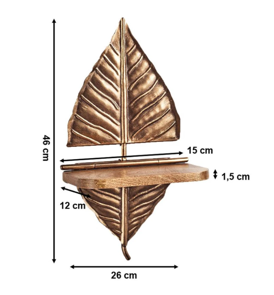 Dodejte vašemu domovu nádech půvabu a spojení s přírodou s nástěnnou policí ve tvaru listu. Tento stylový designový kousek dodá každé místnosti nádech přírodní krásy. Tento stylový designový kousek dodá každé místnosti nádech přírodní krásy. Umělecky vytvořená struktura listu připomíná elegantní sochu na zdi, zatímco malá polička je ideální pro stylové vystavení vašich oblíbených doplňků, klíčů nebo drobných dekorativních předmětů. Tato zlatá nástěnná police, která se perfektně hodí do obývacího pokoje, chodby nebo ložnice, kombinuje funkčnost s luxusním vzhledem a zaručeně upoutá pozornost každého.
